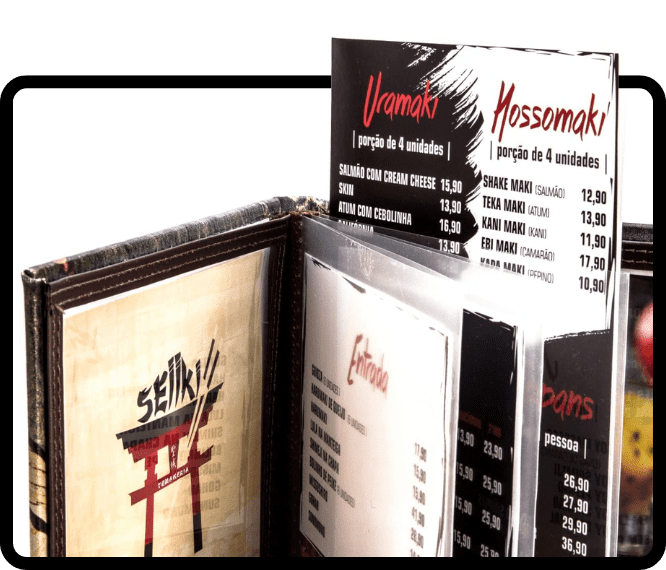 Não se trata apenas de criar cardápios bonitos. Nosso foco está em produzir toda uma experiência que começa na visão, mas que passa também pelo toque. Por isso, trabalhamos com diversos tipos de papéis e capas para criar a melhor experiência sensitiva do seu cliente.